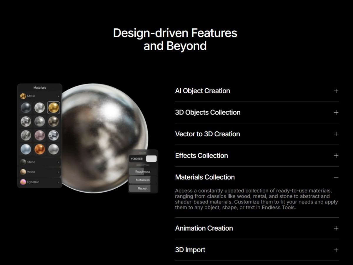 Endless ist ein kreatives Tool zur Erstellung moderner 3D-Visuals für Web, Branding und digitale Produkte. Du kannst eigene Designs hochladen oder mit vorgefertigten Formen und Figuren arbeiten und diese direkt als 3D-Objekte visualisieren. Materialien, Texturen, Farben und Oberflächen lassen sich detailliert anpassen, sodass realistische und gleichzeitig stylische Ergebnisse entstehen, die sich perfekt in moderne Webseiten integrieren lassen.