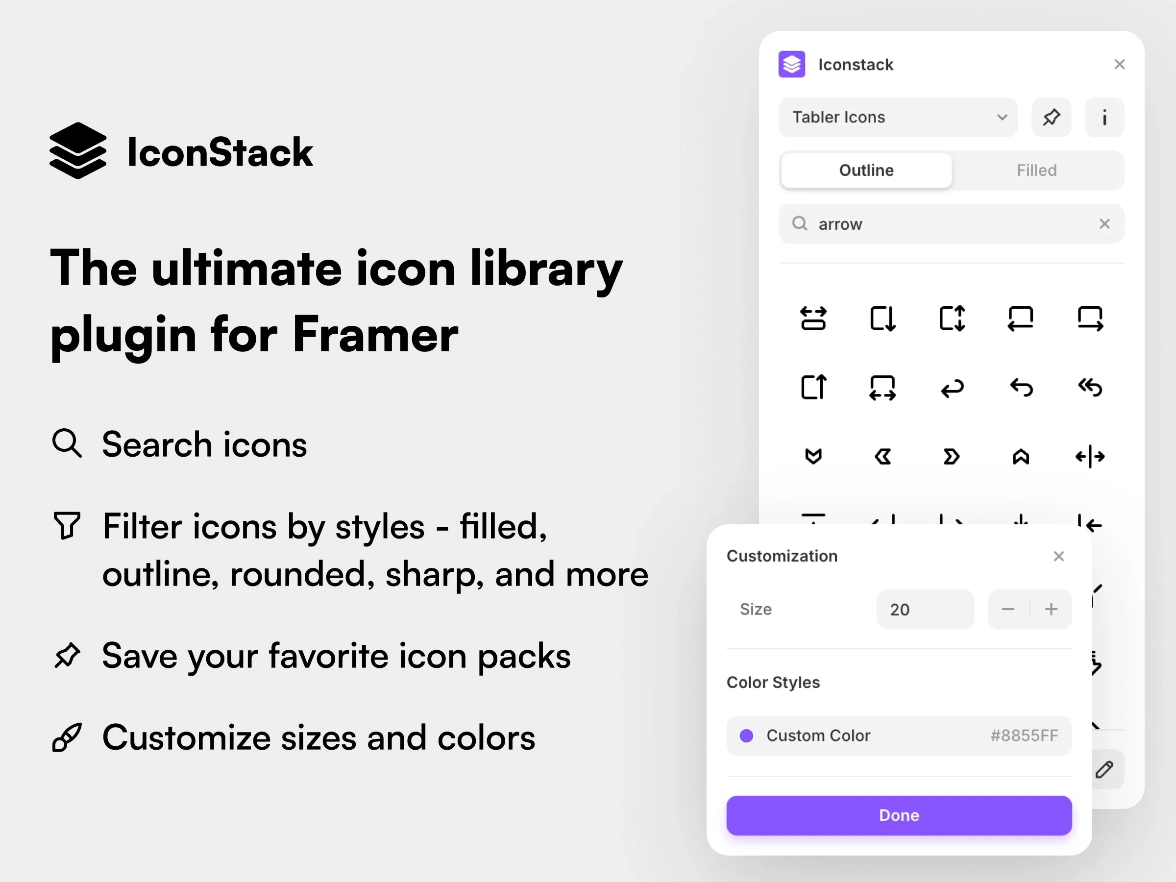 IconStack ist ein umfangreiches Icon-Plugin für Framer, das dir Zugriff auf über 40.000 Icons aus mehr als 20 Open-Source-Iconpacks bietet. Mit einem Klick kannst du Icons suchen, filtern, direkt in dein Projekt einfügen und vollständig anpassen, inklusive Farbe, Größe und Stil. Perfekt für jedes Designsystem, jede Website und jede UI-Komponente.