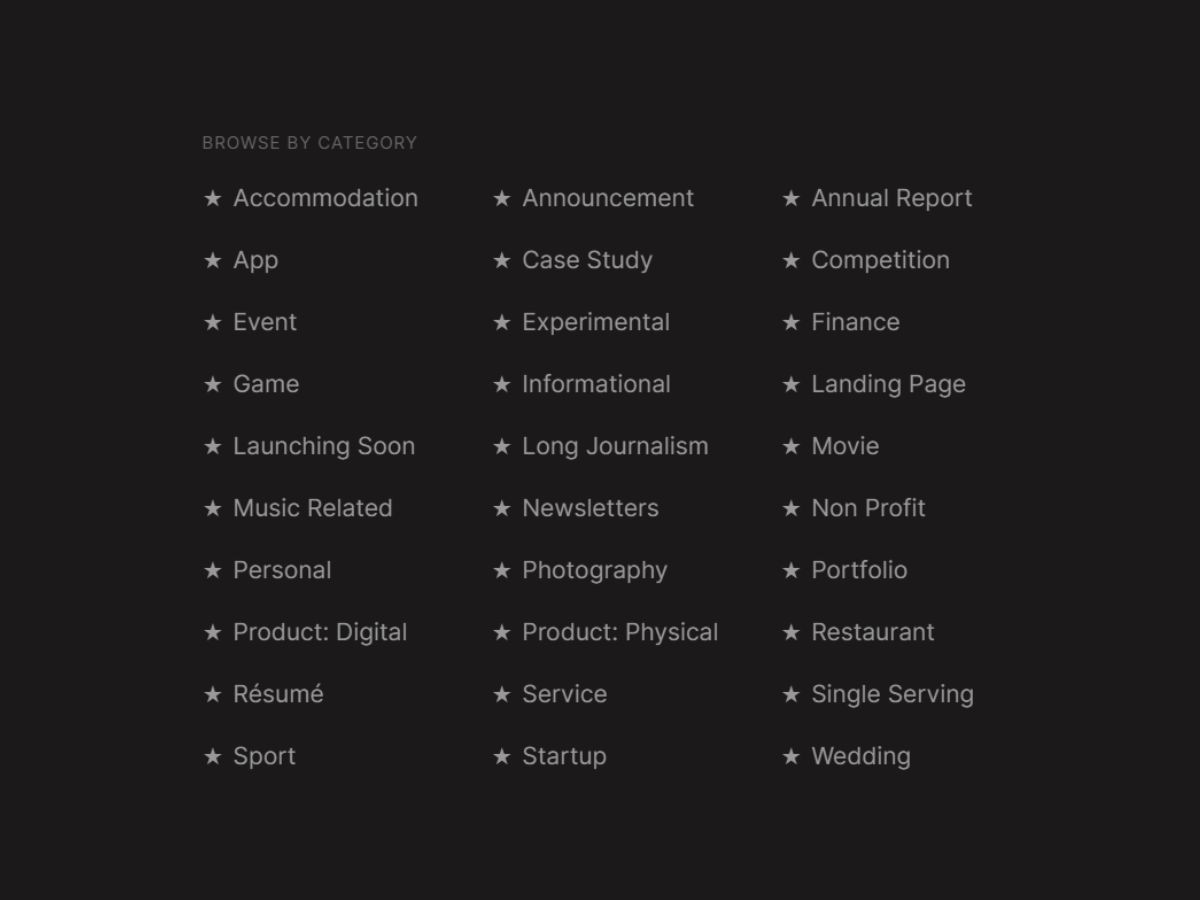 Du kannst die gezeigten Webseiten auch nach inhaltlichen Kategorien filtern. Ob Landingpages, Case-Study-Webseiten, Finance-Websites oder andere Branchen und Anwendungsfälle, so findest du schnell passende Beispiele für dein aktuelles Projekt.