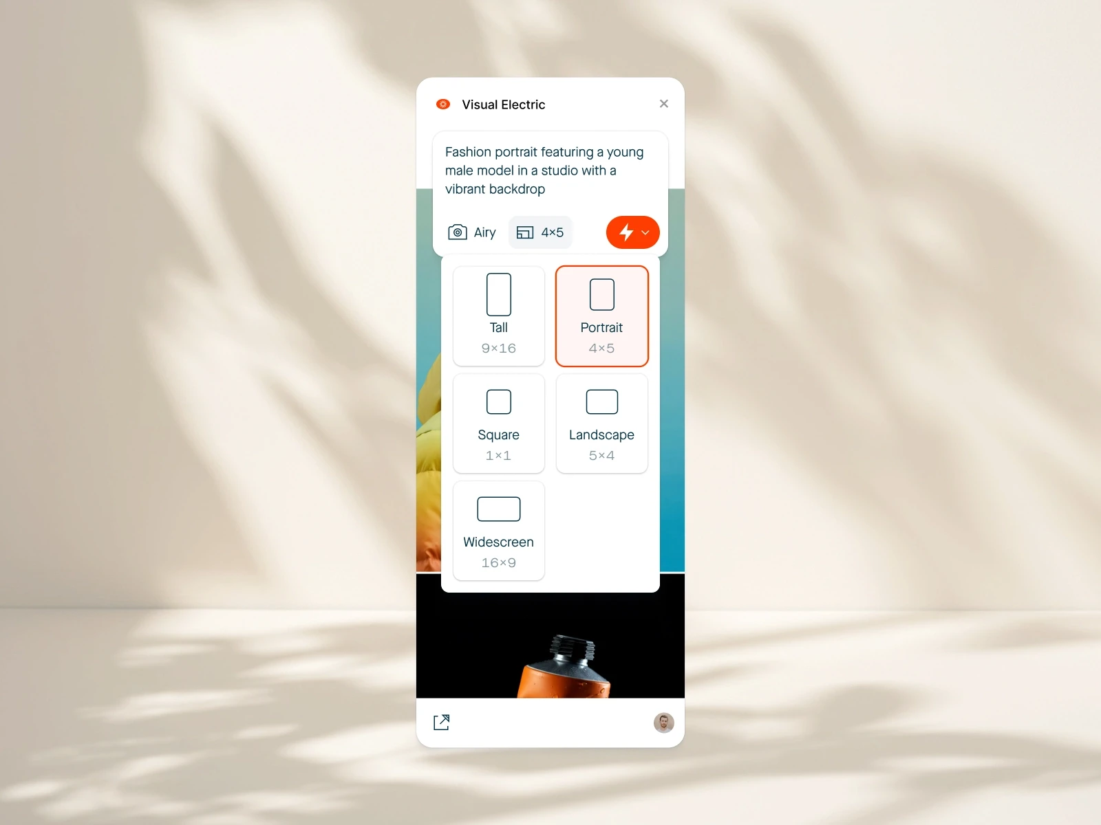 Wähle frei zwischen verschiedenen Aspect Ratios wie Portrait (4:5), Tall (9:16), Square (1:1), Landscape (5:4) oder Widescreen (16:9). Damit lässt sich jedes Bild perfekt an den gewünschten Layout-Bereich anpassen – unabhängig davon, ob es für Hero-Sections, Cards, Mobile oder Fullscreen gedacht ist.