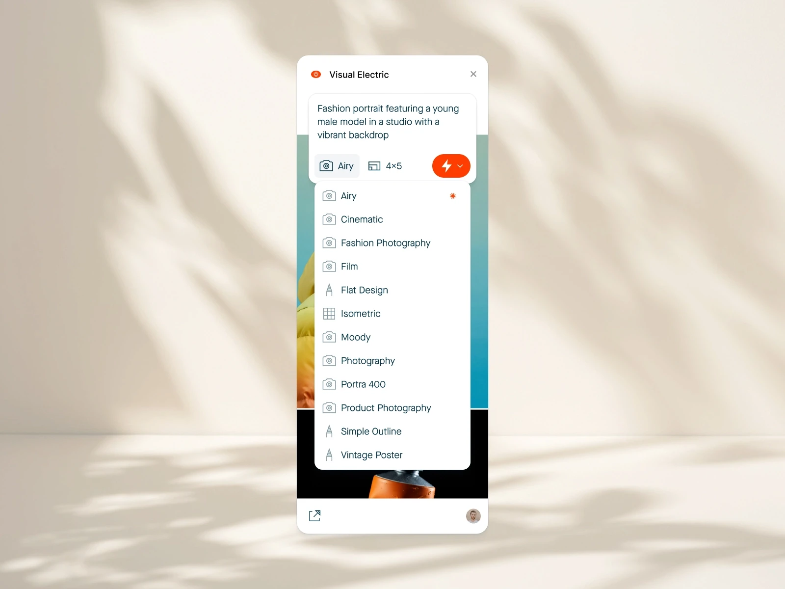 Visual Electric bietet zahlreiche Style-Presets wie Cinematic, Film Look, Fashion Photography, Moody, Isometric oder Vintage Poster. Du kannst mit einem Klick bestimmen, wie dein Bild wirken soll – ob filmisch, natürlich, künstlerisch oder modern.